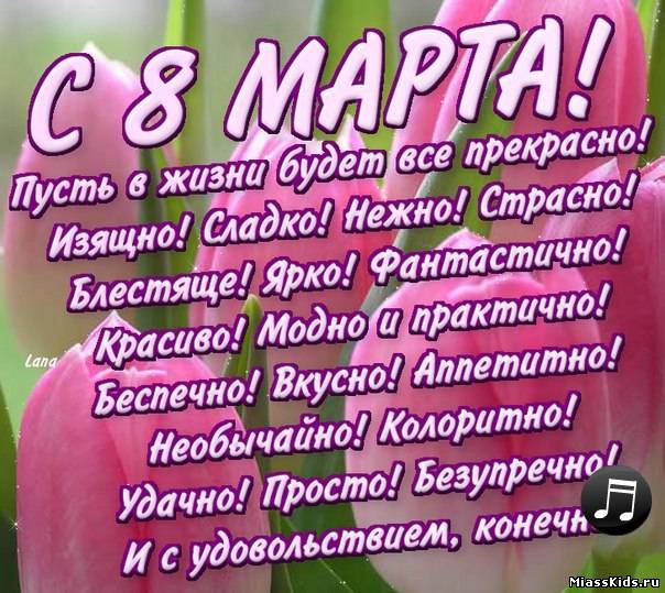 | для позитива) Что Женщине нужно на самом-то деле, Мы более-менее, вроде бы, знаем! И все, что себе пожелать вы хотели б – Мы именно этого вам и желаем! Успехов – в работе! Погоды – приятной! Любви – чистой, нежной и неоднократной! Детей – разнополых! Пальто – по фигуре! Соседей в купе – что не пьют и не курят! Волос – шелковистых! Зубов – белоснежных! Мужей – состоятельных! Спонсоров – нежных! Любовников – умных! Супругов – в законе! Свекровей – живущих в другом регионе! Невесток – покорных! Тарелок – помытых! Мужей – не храпящих и на ночь побритых! Коллег – не зацикленных только на бабах! Врагов – слабосильных! Врагов – сильно слабых! Обедов – в постель! Впечатлений – полярных! И... этих... ну... в общем, того... регулярных! Чулок – без затяжек! Ни дня – без обновки! Мужей – в очень длительной командировке! Любви – обжигающей, как в сериале! По пять сериалов – на каждом канале! Романов – курортных! Порывов – безумных! Соседей и снизу и сверху – бесшумных! Поездок – не на огород, а на море! Пироженок – вкусных, но чтоб без калорий! Машин – иностранных, но руль чтобы слева! Духов – от Диора! Цветов – ежедневно! Намерений – разных, но лучше серьезных! Жилищ – пятикомнатных и пятизвездных! Заслуженный отпуск – на пляжах и волнах! Троллейбусов – вовремя и чтобы неполных! Билетов в автобусах – только счастливых! Друзей – не занудных! Подруг – не ревнивых! Мужей – состоятельных! (Как говорится, Раз сильно желаешь – не грех повториться!) Любви – чтобы воспламенялась, как порох! (Когда это важно, не жалко повторов) Стиральных машин, пылесосов, комбайнов – И функциональных, и стильных дизайнов. Страстей – изнурительных! Трудностей – кратких! Брильянтов – не меньше, чем 40 каратов! Сантехники – импортной! Родов – без боли! Проблем – никаких! Шифоньеров – без моли! И... кажется... что-то еще мы забыли... А-а-а, ясно! Любви!!! И сервантов – без пыли!!! И сбыться – мечте стать великой артисткой!!! И Женского Дня – в год хотя бы раз 300!!!