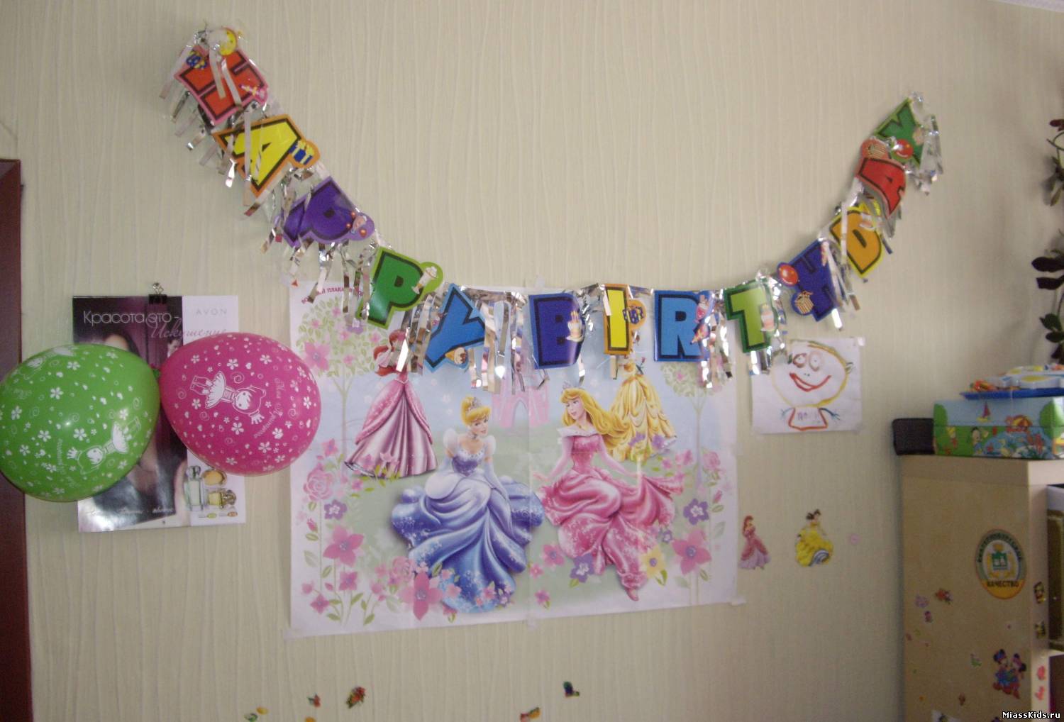 | Quote (Снежок) Пока могу похвастаться небольшим кусочком украшенной комнаты (на самом деле шары просто повсюду), но тут мне очень нравится Полин рисунок (справа от принцесс) - ее автопортрет. красотка))))