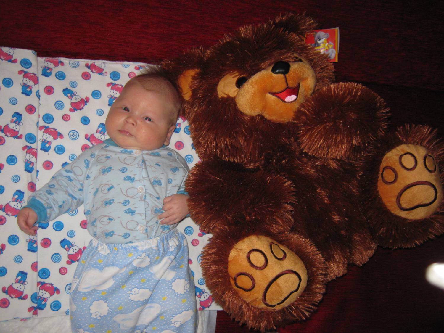 | Вот наш именинник с подарочком ! Наша первая мягкая игрушка двоюродные братья мужа подарили