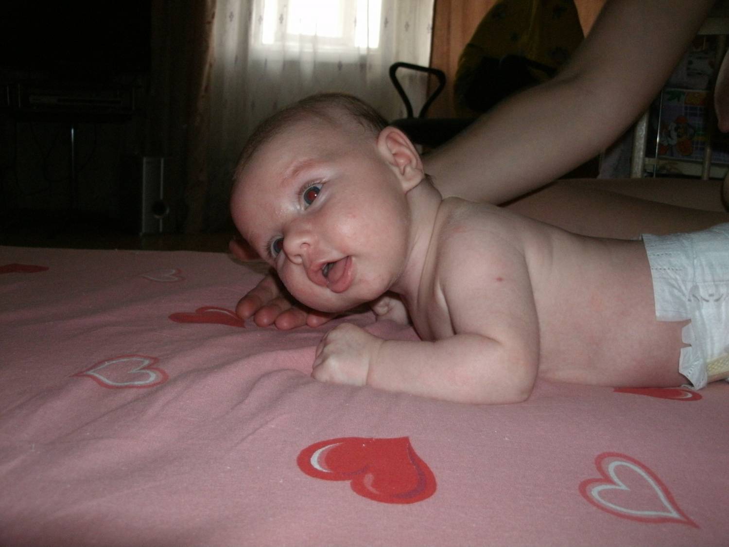 | Спасибо Quote (egozza) сынок у тебя на кровати лежит??лучше на твердое(типо стол,накрытый полотенцем или одеялком)проще ему будет упираться и поднимать голову. На нашем диване лежит, на котором мы спим. Диван так то твердый....чуть чуть мож проминается