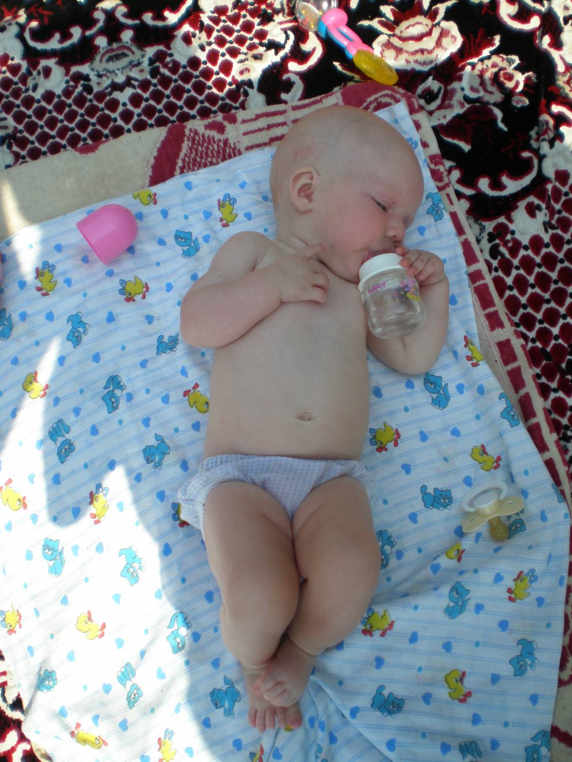 | Сходили мы сегодня на прием...прибавили лишь 500 гр., итого мы сейчас - 5100, а вот в росте даже сантиметра не прибавили Но врач ничего по этому поводу не сказала....Кровь сдавали, мочу и калл, все хорошо, кроме гемоглобина, он все лишь - 103 (норма 110), мне сказала дополнительно пить железо. Баня в субботу у нас прошла отлично, даже даже не капризничал будем продолжать знакомство с ней....