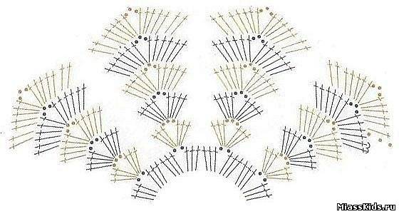 | сначала крючком по приложенной схеме вяжется часть которая на плечики (верхнюю часть я расчитывала так чтобы голова пролазила и узор сохранился) а потом по внутреннему диаметру получившегося круга набираются петли и дальше резинкой любой вяжется часть на шейку. и все.. коряво написала, но тот кто вяжет - разберется..