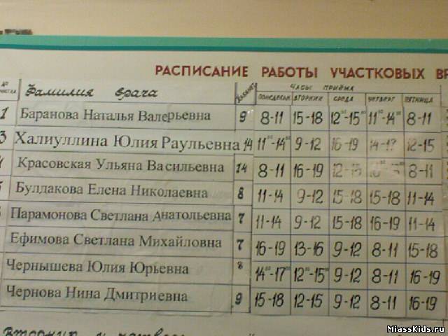 | Quote (Irunchik) На автозаводе тоже полисы готовые лежат (где магазин был дочки-сыночки). А сегодня приходил молодой человек и принес на дом готовые полисы - бывших хозяев квартиры, очень жалко что не наши. Так что даже по домам их разносят, и старые забирают У нас 3 января в 9 вечера к маме пришли (Маша там прописана) и хотели поменять, но так как мы там не живем то договорились на 4, я все документы маме отдала и 4 вечером у нас был уже новый полис Quote (Милёнок) Девочки, ни сил, ни времени нет писать. Но я сегодня забегала в поликлинику, сфоткала на телефон расписание новое. Не могу не выложить. Это машгородок. Может пригодиться кому. Почти все хорошо видно Милёнок, спасибо огромное за новое расписание!!! я это расписание добавила в нашу группу в Контакте, чтоб все могли посмотреть говорят там еще и участки немного поменялись...